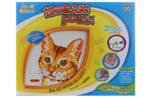 Mozaika s motívom mačky. Balenie obsahuje základňu na stavanie obrázku, pinzetu a 2 háčiky na zavesenie hotového obrázku.