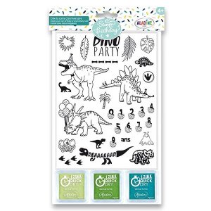 Sada 8 detských pečiatok s motívmi dinosaurov a pečiatkový vankúšik čiernej farby.