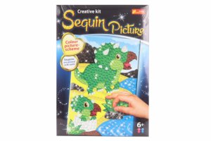 Sada obsahuje predlohu s motívom dinosaurov, sadu flitrových doplnkov a klinčekov pre jednoduchú aplikáciu a ilustrovaný návod krok za krokom.