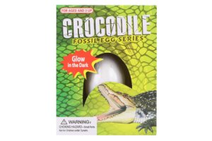 Tesanie krokodílie vajcia. Každé balenie obsahuje vajcia s krokodílom vo vnútri, ktorý svieti v tme a 2 tesacie dláta.