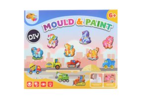 Balenie obsahuje sadru, plastovú misku, plastovú formu so 6 druhmi autíčok, 6 farbičiek na vyfarbenie, štetec, magnety - môžete vytvoriť magnetku a návod na prípravu.