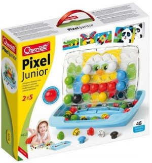 Mozaika pre mladšie deti. Obsahuje 48 gombíkov O 3 cm v celkom 6 farbách, 8 vzorových obojstranných kariet a transparentnú dosku s otvormi v inovovanom dizajne s rukoväťou pre ľahké prenášanie.