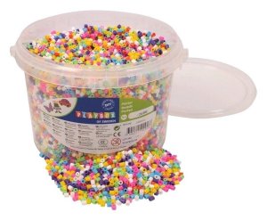 Veľké vedierko plné 20 000 farebných korálikov vo veľkonočných odtieňoch, ideálne pre tvorenie originálnych motívov.