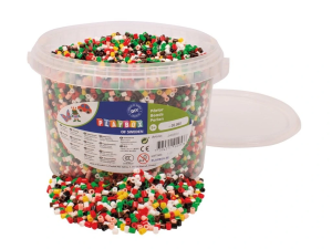 Veľké vedierko plné 20 000 farebných korálikov vo vianočných odtieňoch, ideálne pre tvorenie originálnych motívov.