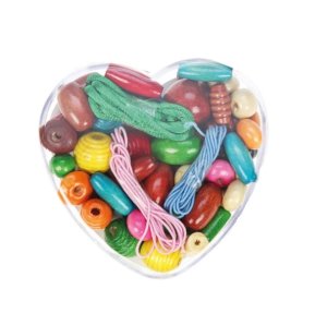 Plastová dóza obsahuje veľké drevené korálky a farebné šnúrky na ktoré možno korálky navliekať.