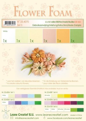 Sada špeciálnych penoviek Foamiran, formát A4 (21x29,7 cm), hrúbka 0,8 mm, 6 farieb: biela, svetlo žltá, svetlo ružová, svetlo fialová, svetlo modrá, pastelovo zelená.