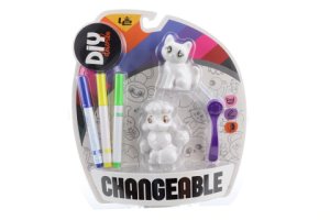 Balenie obsahuje 2 zvieratká z plastu-mačičku a psíka, štetec a 3 fixky.