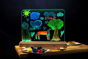 Čarovná tabuľka LED z náučnej série PRESCHOOL! Fluoreskujúca žiara vašich obrázkov, písmen a slov vás privedie k úžasu! S LED Kúzelnou tabuľkou a FLUO-fixmi sa môžete poriadne vyšantiť a popustiť uzdu svojej fantázii! Okrem toho sa s pomocou predlôh na maľovanie a písanie učíte hravou formou. tabuľka má 8 rôznych režimov podsvietenia.