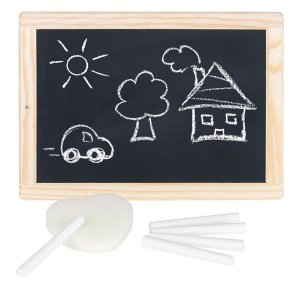 Čierna bridlicová tabuľka v drevenom ráme je obojstranná.