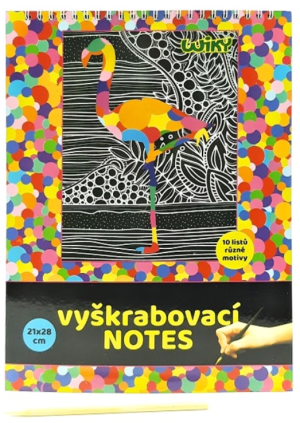 Vyškrabávací zošit s krúžkovou väzbou. obsahuje 8 čiernych listov s farebným podkladom, kde si dieťa môže namaľovať obrázok podľa vlastnej fantázie.