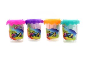 Výroba slizu v tégliku. Sada obsahuje plastový klímok s viečkom, prášok na prípravu slizu, trblietky a malú figúrku.