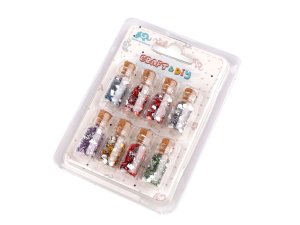 Sada 8 sklenených fľaštičiek s mini plastovými kamienkami sa hodí na dozdobenie mozaiky, nalepenie na priania a pod.
