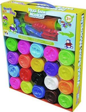 Obsahuje 6 veľkých téglikov s plastelínou, formičky, vykrajovátka aj vytlačovacie lisy, šablóny, valček atď.