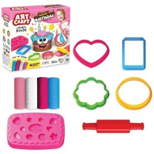 Obsahuje 6 veľkých téglikov s plastelínou, formičky, vykrajovátka aj vytlačovacie lisy, šablóny, valček atď.