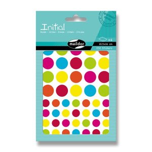 Samolepky Maildor Inital s rôznymi farbami a veľkosťami koliesok.
