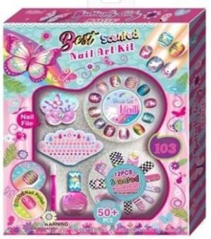 Súprava na lakovanie nechtov Diamond Besties – obsahuje aplikátor diamantov, 6 rôznych farieb diamantov, 4 laky na nechty, hubku, umelé nechty a triedič na kamienky.