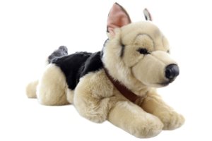 Plyšový Nemecký ovčiak ležiaci s postrojom.