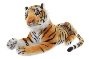 Plyšový hnedý tiger o veľkosti cca 55 x 28 x 18 cm (bez chvosta), dĺžka chvosta cca 37 cm.