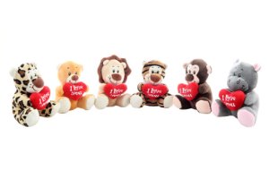 Plyšové divoké zvieratko so srdiečkom s rozmermi cca 14x13x11 cm. 6 druhov - dodávame podľa skladovej dostupnosti.