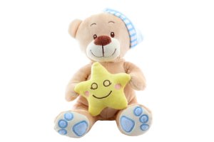Plyšový medvedík s hviezdičkou s rozmermi 23x15x18 cm.