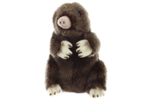 Plyšový krtko sediaci o veľkosti cca 18 x 18 x 10 cm.