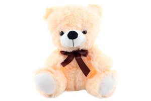 Plyšový medveď s mašľou o rozmere cca 20 x 25 x 15 cm.