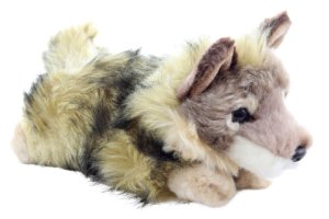 Plyšový kojot ležiaci s rozmermi 25x7x11 cm.
