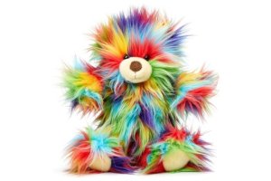 Plyšový farebný medveď s rozmermi 23x20x8 cm.