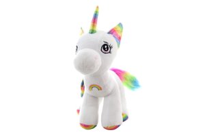 Plyšový ležiaci jednorožec - biely s dúhovými doplnkami.