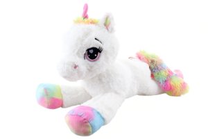 Plyšový ležiaci jednorožec - biely s dúhovými doplnkami.