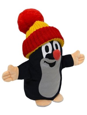 Plyšová postavička Krtka s modro-žltým čiapkou.