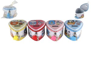 Plechová pokladnička s motívom smajlíkov o veľkosti cca 12 x 8,5 cm.