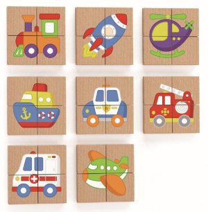 Osem skladačiek s dopravnými prostriedkami vyrobených z vysoko kvalitného dreva.