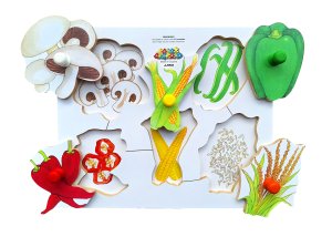 Just Jigsaws 153 Lúpeme a krájame plodiny 4 - drevené doskové puzzle 6 dielov predstavuje drevenú skladačku s štipcami pre ľahký úchop, ktorá deťom krásne znázorňuje, ako vyzerá zelenina, huby, kukurica.