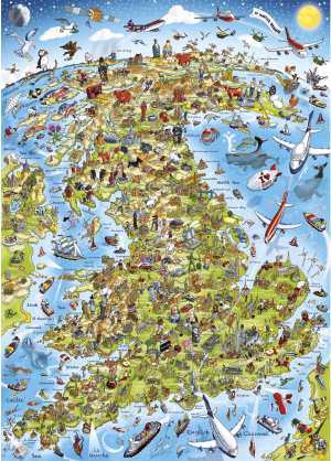 Puzzle od karikaturistu Mattiasa Adolfssona balené v netradičnej trojbokej krabici, ktorá obsahuje plagát ako predlohu na skladanie.