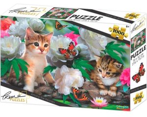 Puzzle s nežným motívom pivoniek a mačiatok.