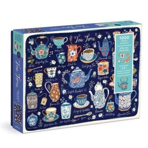 Puzzle obsahuje množstvo prvkov na prípravu čaju, ako sú čajové kanvice, podšálky a lyžičky.