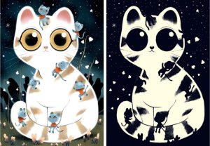 Fluorescenčné (neónové) puzzle s motívom prítulných mačiek svietiacich v tme. zvláštnosť spočíva v neónovej farbe, ktorá obraz v tme oživí po tom, čo sa puzzle „nasvieti“ pri dennom svetle, v noci niekoľko …