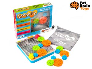 Hlavolam Crankity. Balenie obsahuje 14 ozubených koliesok, kľučku, vkladaciu plochu a 40 kariet s hlavolamami.
