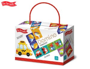 Domino XXL s motívom dopravných prostriedkov obsahuje 28 drevených veľkých dielikov, na ktorých sú znázornené veselým spôsobom hasiči, sanitka, policajné vozidlo, mašinka, parník, vrtuľník a lietadlo.