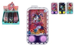 Vodná hra v tvare mobilu. Stláčaním tlačidla treba chytiť krúžky na tyčky vo vnútri vonia hry. Veľkosť cca 6,5 x 14 cm. Vek 3 +