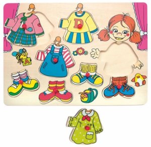 Drevená vkladačka s obrázkami oblečenia Rozmery drevenej dosky cca 22,5 x 22,5 cm.