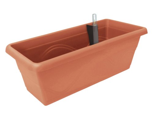 Samozavlažovací plastový kvetináč s hladinomerom a SMART systémom, ktorý je vybavený otvormi v rošte pre vhodné umiestnenie napájacieho dielu. Truhlíka má na jednej strane vyvýšené dno, to je vhodné odvŕtať na odtok prebytočnej dažďovej vody. Vyrobený z matného, kvalitného recyklovaného plastu. Český výrobok. Farba: terakota. Šírka: 40 cm, výška: 17 cm, hĺbka: 20,5 cm.