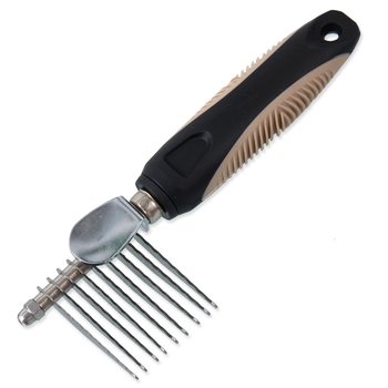 Trimovací hrebeň s plastovou rukoväťou.