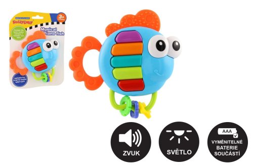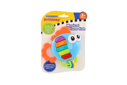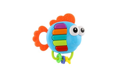 Hrkálka v tvare rybky je vďaka svojim veselým farbám a tvaru u detí veľmi obľúbené. Hrkálka po stlačení klávesov hrá melódie a tóny jednotlivých klávesov. Pri hre klávesy svieti. Na zadnej strane je možné nastaviť zvuky melódií alebo tóny. Je vyrobené z plastu a je možné ho tak ľahko umyť. Je na batérie 2x1,5V (AAA), ktoré sú súčasťou, na zadnej strane je poistka, ktorú treba pred hraním vybrať. Rozmer hrkálky: 14 x 14 cm Vhodné pre deti od 3 mesiacov