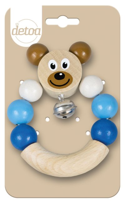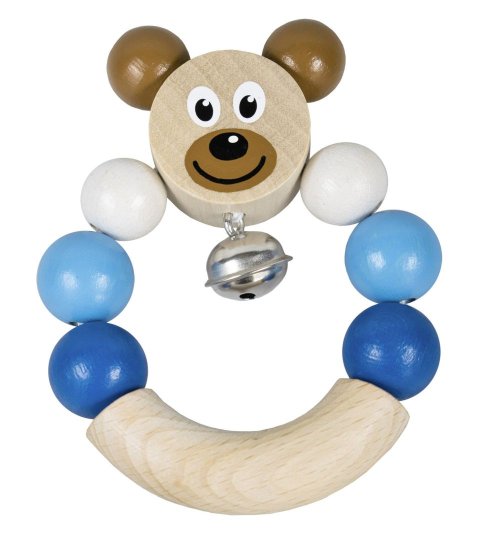 Drevená hrkálka s medvedíkom v modrej farbe. Ľahko uchopiteľné, rolnička jemne cinká.