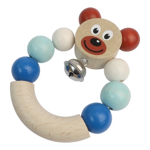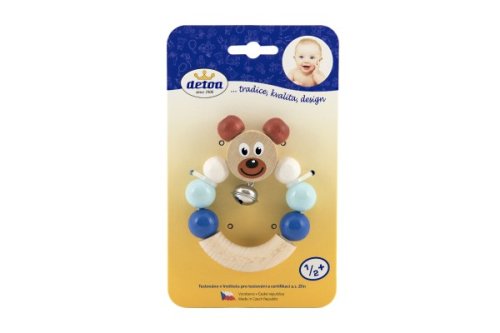 Hrkálka s medvedíkom v modrej farbe. Rolnička jemne cinká. Hrkálka má nízku hmotnosť a je vhodné pre deti od 6tich mesiacov. Výrobok spĺňa požiadavky EÚ na bezpečnosť hračiek. Rozmery výrobku sú 70x90 mm a je pripevnený na papierovej karte. Rozmery balenia 10,5 x 17 x 2 cm.