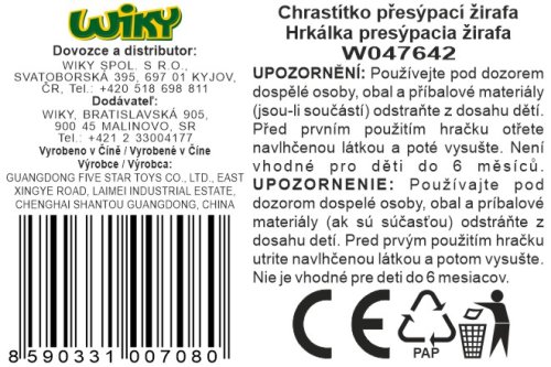Hrkálka presýpacia žirafa. Veľkosť 24,5 cm. Presné rozmery 7x6,5x24,5 cm.