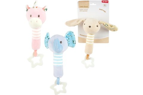 Plyšová hračka pre najmenšie deti s motívom zvieratiek v pastelových farbách. Telíčko zvieratka šuštia a na konci sa nachádza hryzátko. 3 druhy - dodávame podľa skladovej dostupnosti. Balené na karte. Rozmery balenia 29x15x8 cm. Rozmery hrkálky 25x8x8 cm. Vek 4m+