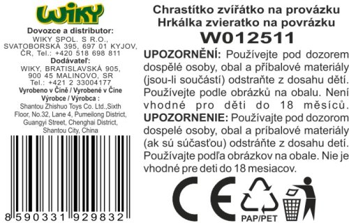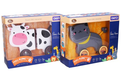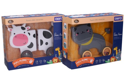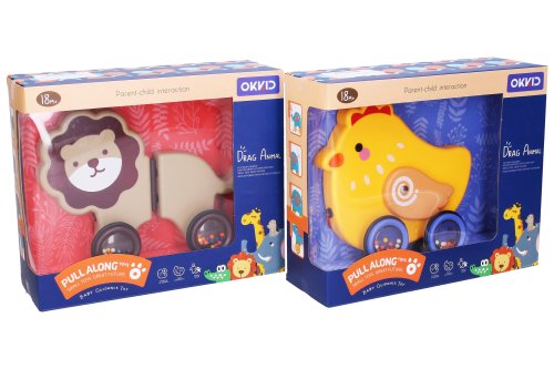 Hrkálka zvieratko na povrázku. Veľkosť 19 cm. 4 varianty - kura, mačka, lev, krava. Voľné kolesá.